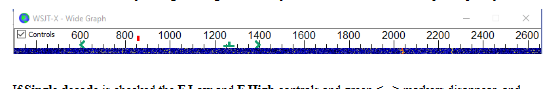 Les limites sont marquées par des symboles de chevrons vert foncé < > sur l’échelle de fréquence Wide Graph: Si le décodage simple est coché, les commandes F Low et F High et les marqueurs verts <> disparaissent, et le décodage n’a lieu que dans la plage RxFreq ± FTol Pour FST4W, la fréquence Rx par défaut est de 1500 Hz et F Tol est de 100 Hz, donc la plage de décodage active est la même que pour WSPR, de 1400 à 1600 Hz. Cependant, vous pouvez sélectionner différentes fréquences centrales et valeurs F Tol pour vous conformer aux conventions de fonctionnement sur les bandes LF et MF.