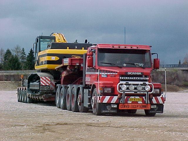 Semi surbaisée 7 éssieux Chargée d'un grue Caterpillar tirée par un tracteur Scania 143
