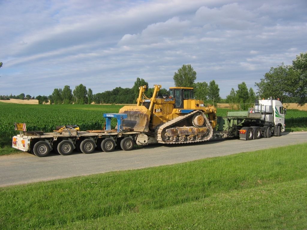 Semi surbaisée 5 éssieux Chargée d'un Bull D 11 R de Caterpillar tirée par un tracteur Volvo FH 16