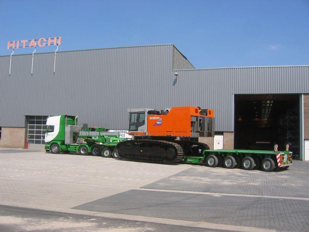 Semi surbaisée 6 éssieux avce une grue Hitachi EX 1200 tirée par tracteur Scania