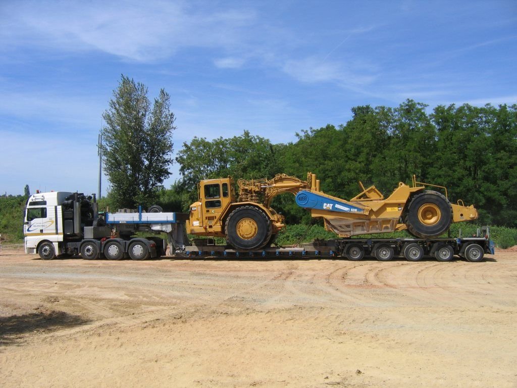 Semi surbaisée 5 éssieux avec un scarpe 637 Caterpillar tirée par un tracteur DAF