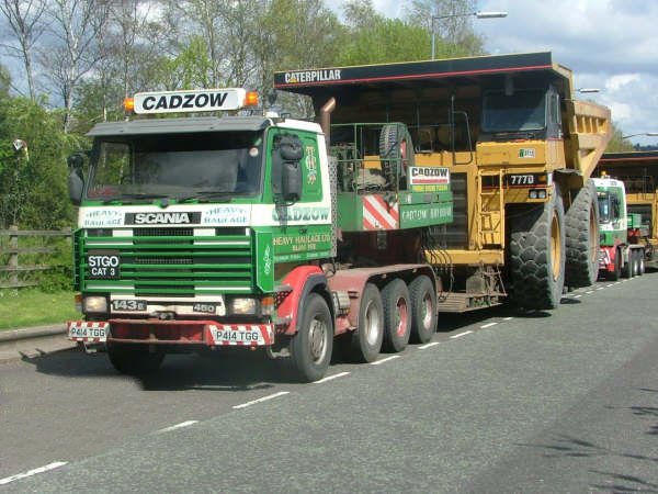 Semi surbaisée 4 éssieux avec un dumper 777 D de Caterpillar tirée par un tracteur Scania 143 E