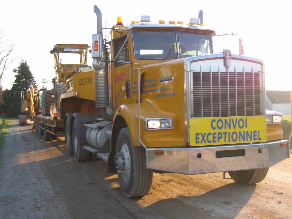 Semi surbaisée 4 éssieux avec une nivelleuse tirée par un tracteur Kenworth