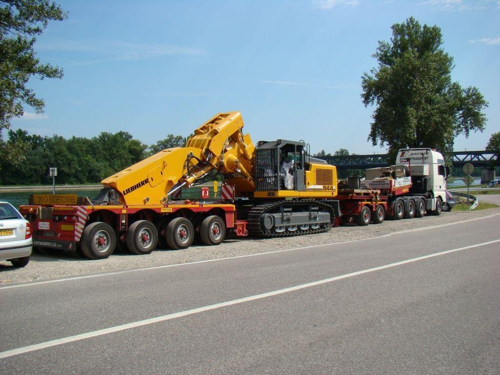 Semi surbaisée 6 éssieux avec une grue Liebherr 944 tirée par un tracteur MAN